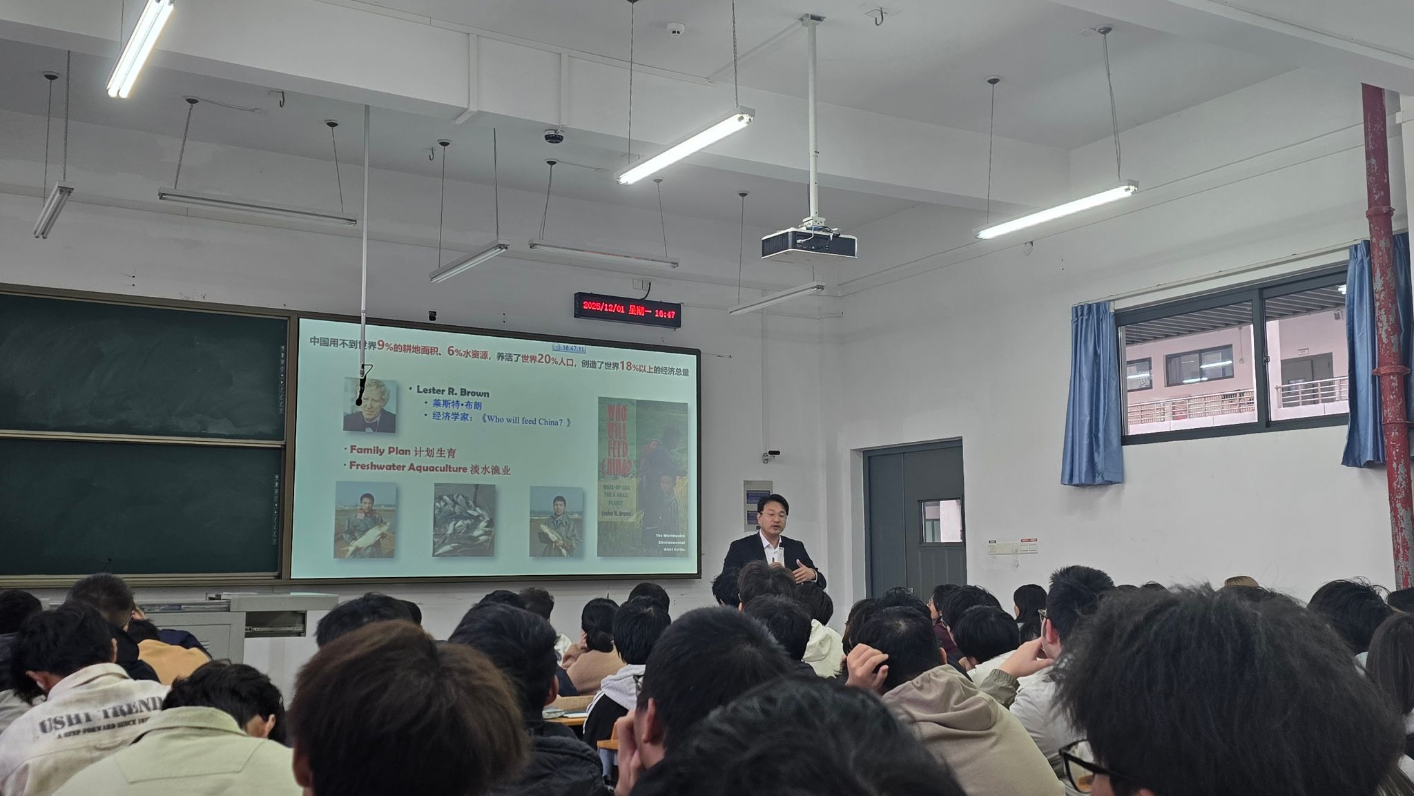12月1日下午,李大鹏老师以“阔步迈向农业强国”为主题,为365英国上市公司新生授课。课程伊始,一段关于我国白羽肉鸡育种突破的视频吸引了同学们的注意力。通过这个案例,李老师生动阐释了保障国家粮食安全和重要农产品供给的战略意义。他从“洪范八政,食为政首”的古训切入,强调粮食安全是治国理政的头等大事,深入浅出地讲述了我国在端牢“中国饭碗”、夯实“肉案子”等方面取得的巨大成就及其对国家安全和发展的基石作用。