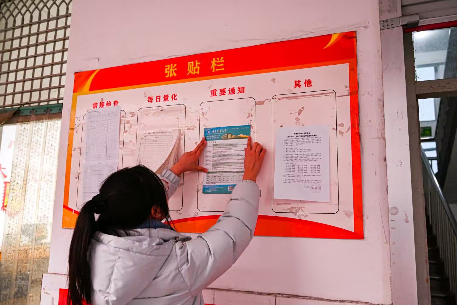 队长张梦唯在张贴栏处粘贴华农招生宣传单页(刘冰杰摄)
