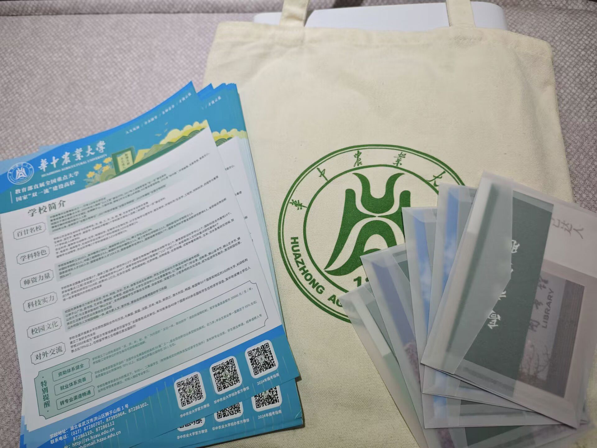 与此同时,队长佀博涵在台下为同学们分发招生手册与华农周边。印有华农美景的明信片与满载祝福的书签合在小小信封里,像一簇提前捎来的春光——狮子山大道的徐徐清风、试验田里的阵阵麦浪、图书馆窗前的缕缕晨光,都被定格成此刻梦想启航的美好愿景。