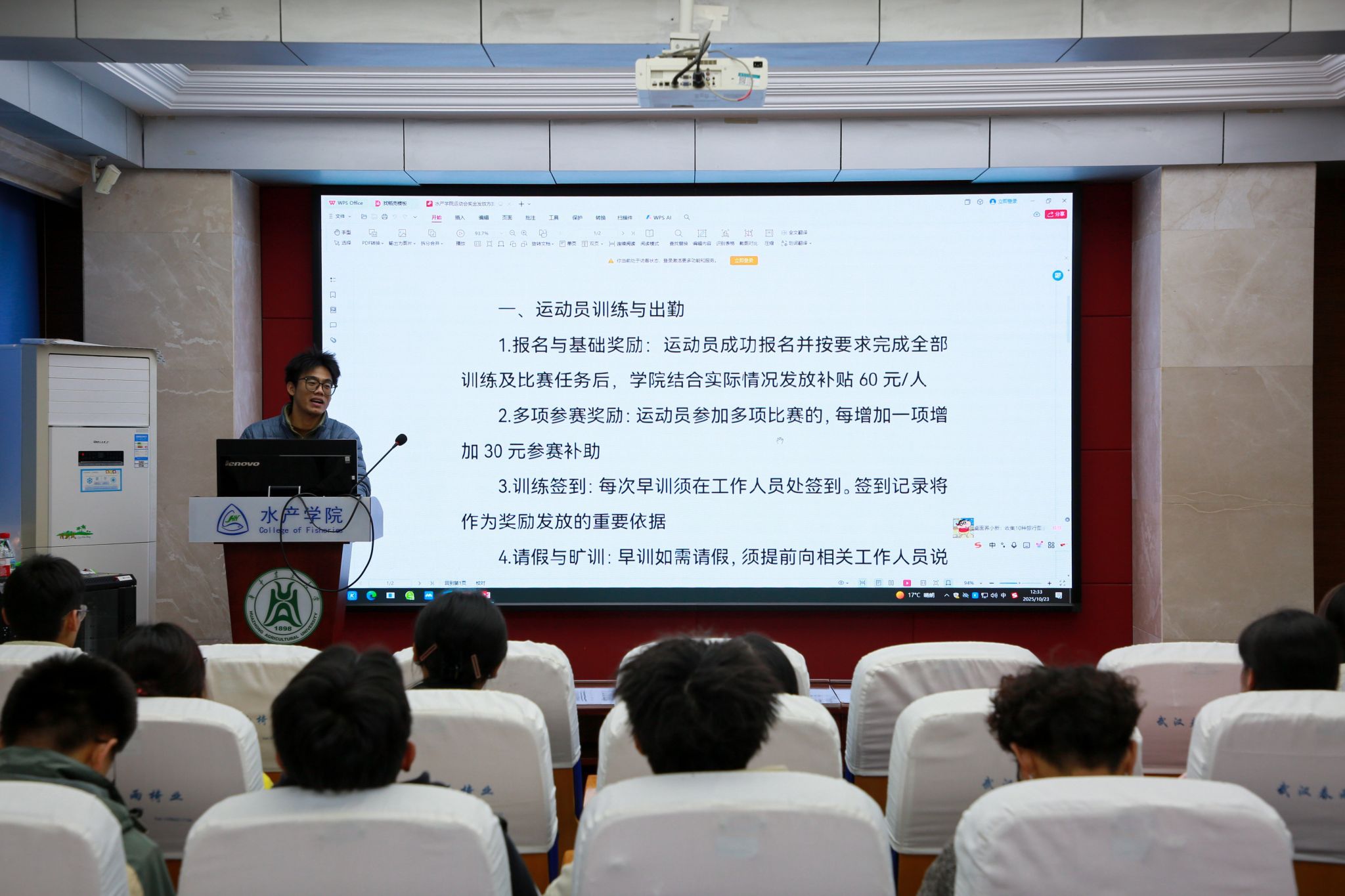 会上,蔡先锋老师对运动员与教练员的补助政策、训练纪律及奖励办法进行了说明。他强调,学院将严格落实考勤制度,确保公平公正;同时设立激励措施,鼓励运动员积极训练、顽强拼搏。学院也将对运动会中表现突出的个人和团队进行表彰,进一步营造积极向上的体育氛围。