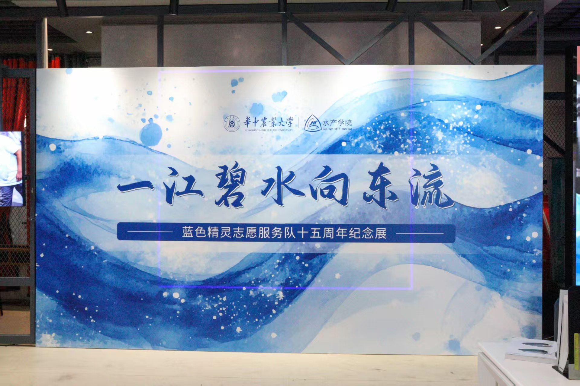 座谈会后,与会人员共同参观了在综合楼展厅举办的“一江碧水向东流”蓝色精灵十五周年回顾展。展览通过图文、实物标本及采样设备,生动再现了团队十五年来的志愿活动轨迹。