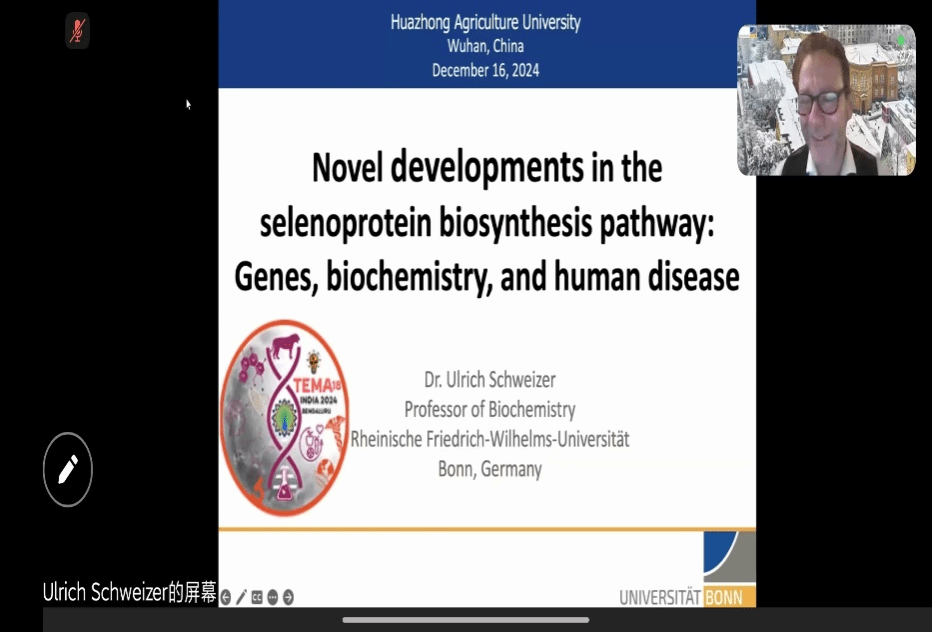 12月16日下午,我院2024年第23期(总412期)“水产讲坛”在线上举行,特邀德国波恩大学的Ulrich Schweizer教授作了题为“硒蛋白生物合成途径新进展:基因、生物化学和人类疾病”的分享。本次讲座由罗智教授主持。