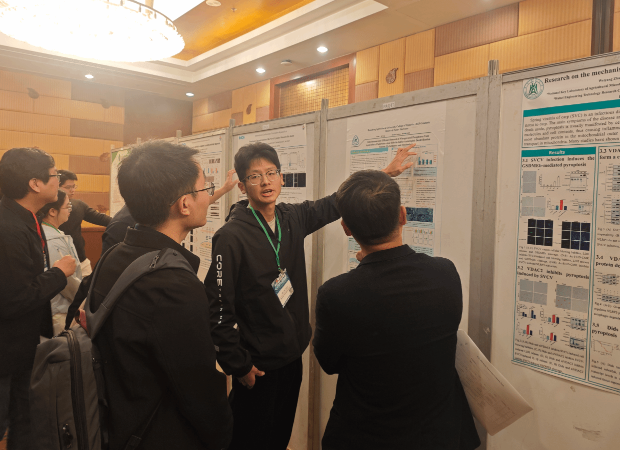 聚焦水产学科前沿方向,我校博士研究生熊宁霞、黄钰微、刘晨旭,硕士研究生张艳、常雯琦分别以“溶血性疾病免疫机制探究”“基因编辑技术在优质鱼类育种中的应用”“养殖鱼类合适脂肪源筛选及代谢调控机制”“鱼类耐低氧生理适应机制解析”“典型鱼类病毒的致病机制及防控技术”为主题在大会上做口头报告,系统分享了我校在相关领域的原创性研究成果与前沿进展。另外8名研究生则围绕鱼类免疫与疾病防控、水产环境治理、水产育种、病原微生物调控等多个关键研究方向,展示了主题兼具理论创新性与实践应用价值的墙报分享。