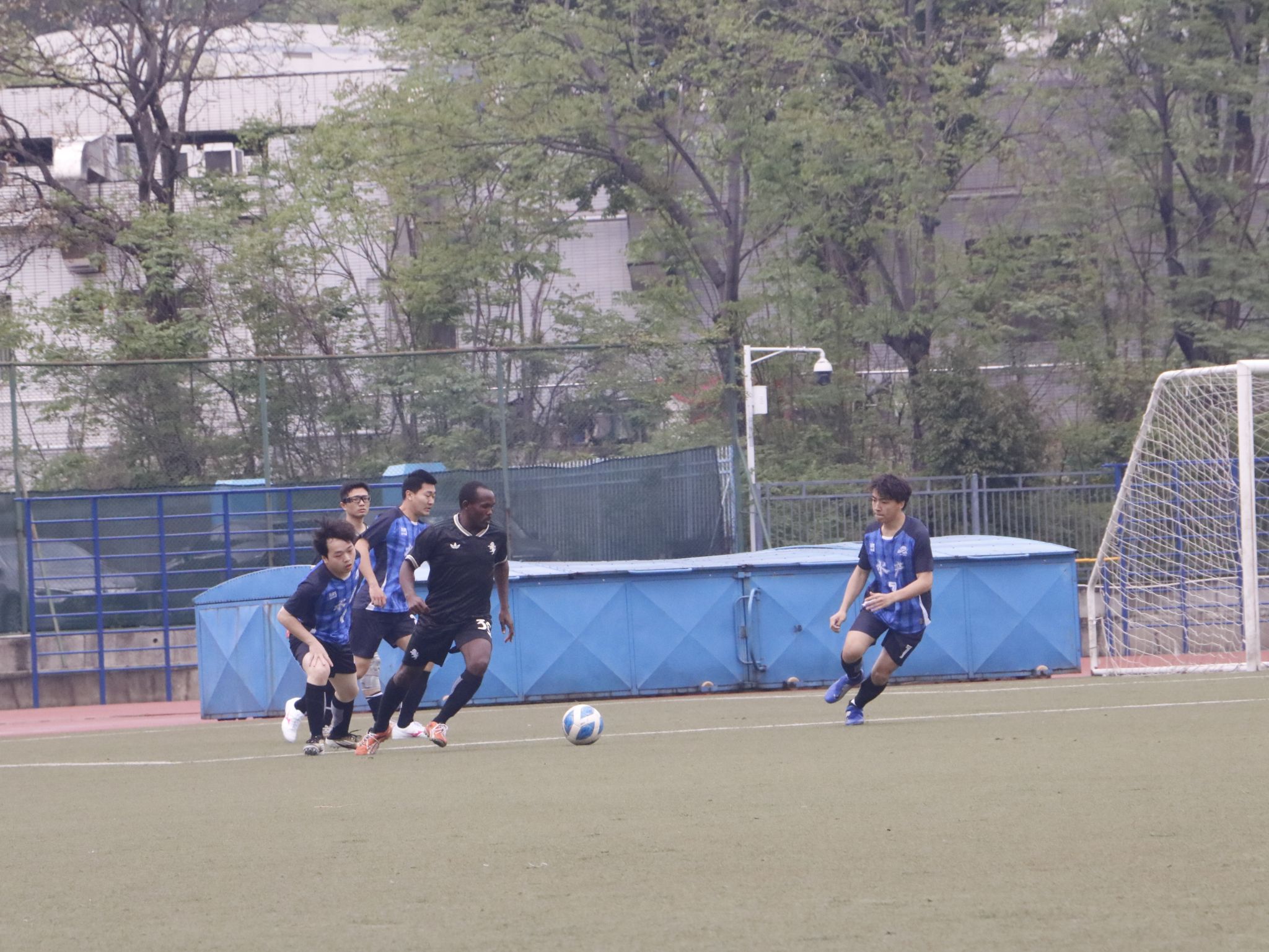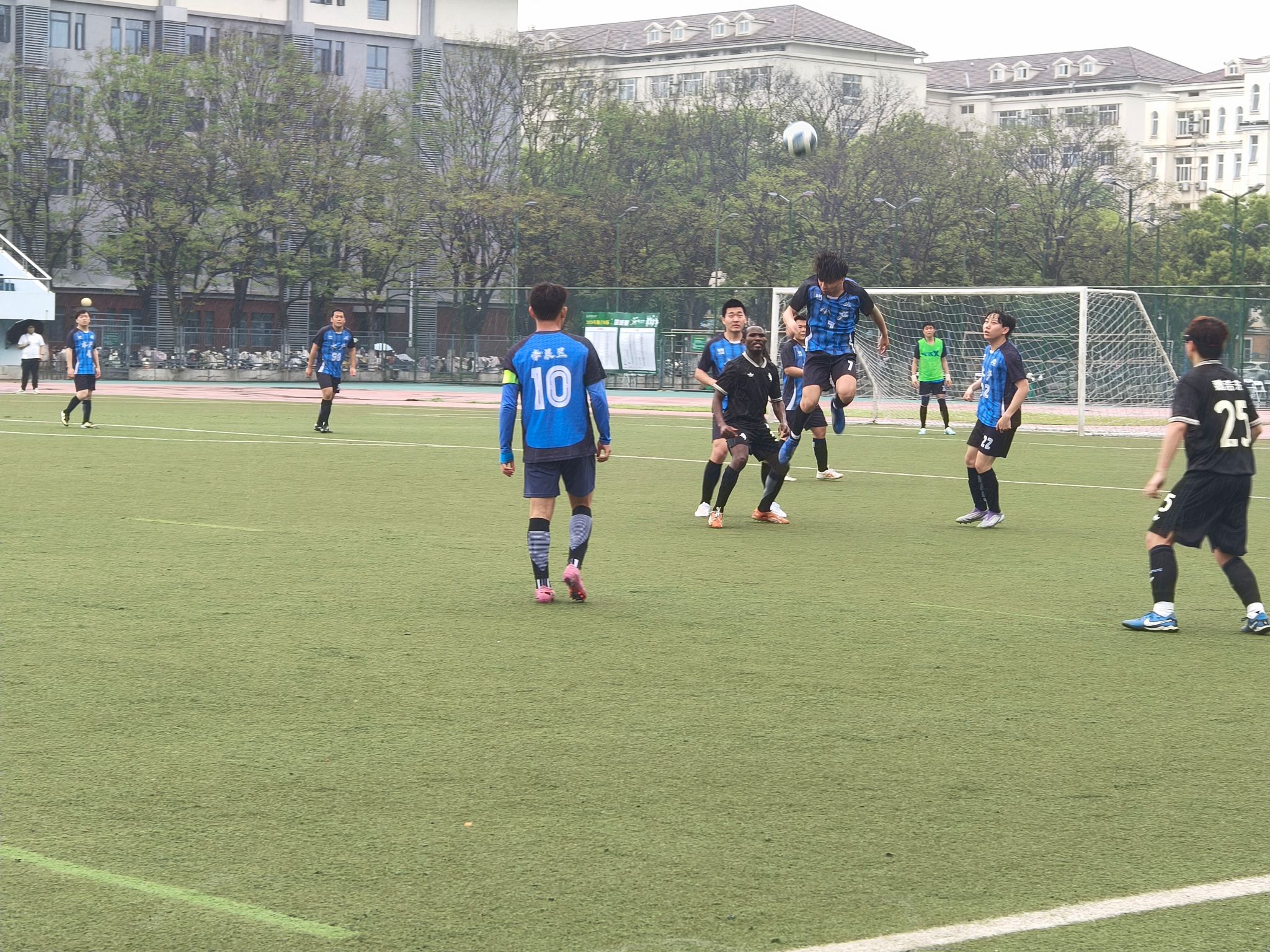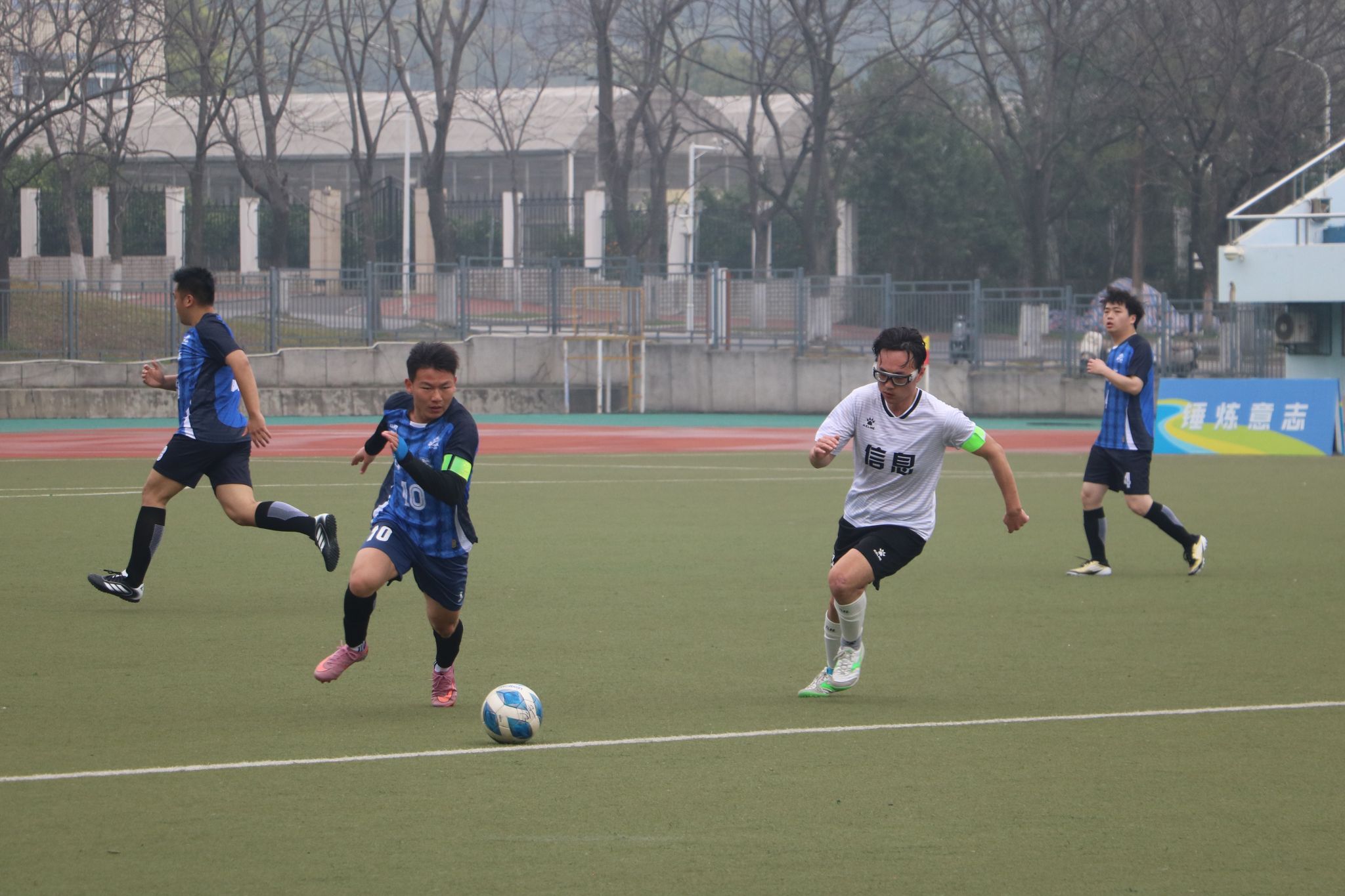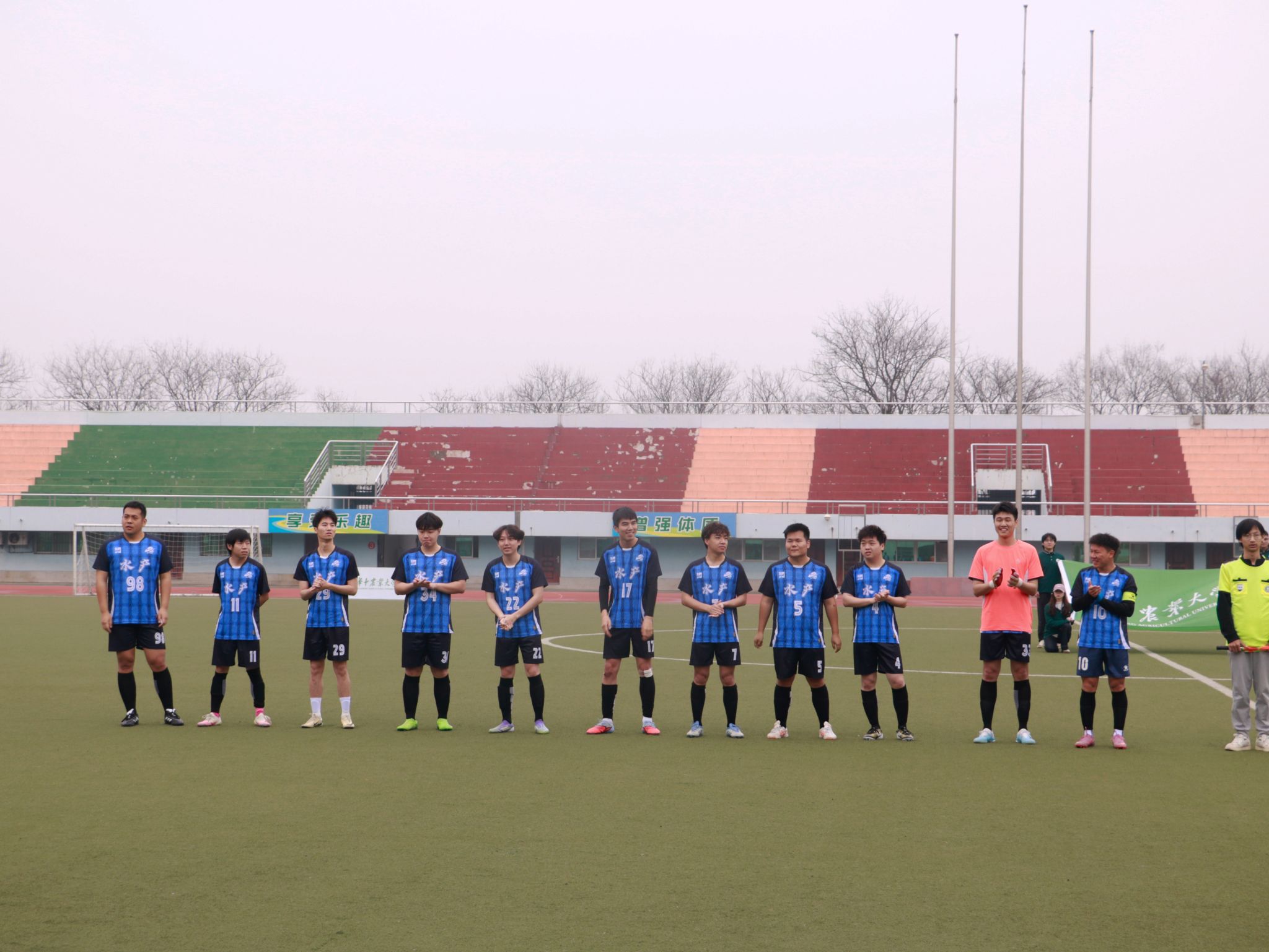 半决赛迎战强敌资源与环境学院代表队。比赛在雨中拉开帷幕,湿滑的场地、积水的草皮,加上风和雨的阻碍,让每一次奔跑和传球都变得格外艰难。开局阶段便陷入被动,比分处于落后。即便后续全队奋力反扑,可对方全线退守严防死守,再加上场地积水严重影响发挥,最终依旧没能改写战局,遗憾失利,无缘决赛。