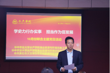 周琼书记简单介绍出席本次活动的黄石大冶湖文旅公司党支部党员骨干与学院领导与教师后,重点介绍了黄石市大冶湖文旅公司党支部“一引三联,共建创新型先进党支部:产业对接,共谋智慧化生态大冶湖”的党建工作思路和本次对接共建活动的目的和意义。曹玉琼代表学院致欢迎辞,对百忙之中参加会议的各位同志表示欢迎,并着重介绍了渔业资源与环境系师生长期在大冶湖开展的社会服务工作,提出党建工作要落实在工作、研究以及育人之中,以社会服务的形式促进行业的发展,实现党建业务的双丰收。渔业资源与环境系教工党支部副书记汤蓉同志带领大家重温入党誓词,黄石大冶湖文旅公司党支部委员领学党章部分章节内容,明确如何做一名合格党员。