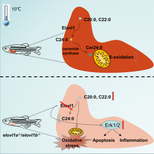 Elovl1作为饱和脂肪酸延伸过程中的重要蛋白,其具有广泛的底物特异性,能够拉长C18-C24 SFA。该团队研究显示斑马鱼中elovl1基因的两个亚型(elovl1aelovl1b)均在低温状态下表现出显著的上调模式,并涉及C20:0、C22:0 SFA往C24:0 SFA的合成。为探究elovl1在低温适应中的作用,该研究创建了elovl1a-/-elovl1b-/-两种斑马鱼敲除模型。低温应激实验结果显示,elovl1a-/-elovl1b-/-斑马鱼突变体在低温下表现出肝脏的氧化应激加重和线粒体代谢紊乱及较低的存活率。体外研究证实,高水平的C20:0和C22:0 SFA可明显增加肝细胞氧化应激水平,并激活细胞外信号调节激酶1/2(Erk1/2)通路,进一步诱导细胞凋亡和炎症导致冷抵抗能力的下降。该研究进一步证明了C24:0 SFA可以通过神经酰胺合成酶(Cers)产生Cer24:0以促进肝细胞的线粒体β-氧化,缓解低温诱导的细胞凋亡从而提高斑马鱼的冷抵抗能力。基于以上结果证明:elovl1通过促进C20:0,C22:0往C24:0的转化缓解了低温诱导的氧化应激与炎症反应,并间接增加线粒体的能量代谢从而提高了斑马鱼的冷耐受能力。本研究进一步完善了鱼类的低温适应策略研究,更为提高养殖鱼类的抗寒性提供科学的理论依据。