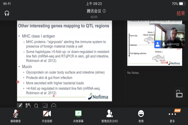 Nicholas Robinson研究员从水产养殖的基础知识及发展展开了此次报告,在正式介绍相关研究前他讲解了与研究相关的背景知识,然后分别以罗湖鲤、绿唇鲍和大西洋鲑为例,介绍了基因组学在提高鱼贝类抗病性和抗逆性中的应用。